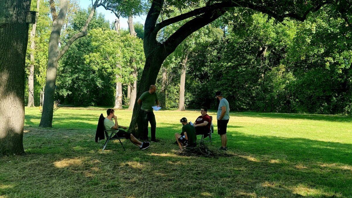 Um die Stimmung zu heben, verlegen wir unser Klassenzimmer einfach nach draußen. Campingstühle, Picknickdecken, Moderatorenkoffer und Flipchart kommen mit – und schon stehen wir am Leipziger Auensee unter einem riesigen schattigen Baum. Dort bauen wir unser „Grünes Klassenzimmer“ auf, klappen Laptops und Tablets auf und starten in den gemeinsamen Austausch. Fast wie Urlaub – na gut, fast.